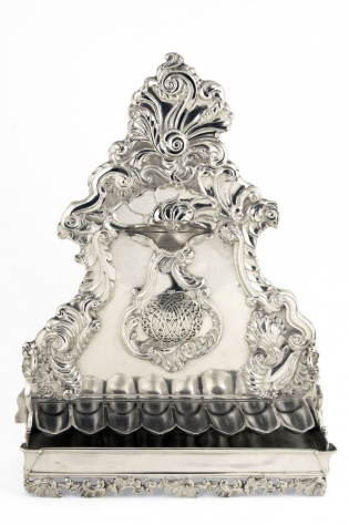 The silver lamp is in the rococo style and has eight oil lamps….In the Netherlands, this variety of lamp, the 'bench type' with a mirror monogram on the panel - the identity of the family is unknown in this case- was used mainly by Portuguese Jews. Ashkenazi Jews typically use candles. With its lavish rococo decorations, this Chanukah lamp from the royal collections is a magnificent and valuable addition to the collection of the Jewish Historical Museum.’
